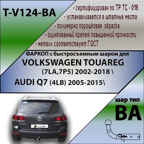ТСУ для Volkswagen Touareg 2002-2010 (требуется вырез в бампере), Volkswagen Touareg 2010-2018, Audi Q7 2007-2015 (без выреза бампера). Нагрузки: 1500/75 кг, масса фаркопа 14,52 кг (без электрики в комплекте)