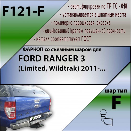 ТСУ для Ford Ranger 3 Limited, Wildtrak 2011-2022 без снятия и выреза бампера. Тип шара: F. Нагрузки: 2000/100 кг, масса фаркопа 19,8 кг (без электрики в комплекте)