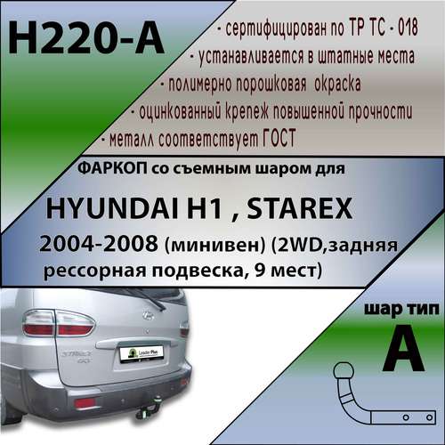 ТСУ для Hyundai H1, Starex 2WD 2004-2007 без снятия и выреза бампера. Нагрузки: 1500/75 кг, масса фаркопа 19,54 кг (без электрики в комплекте)