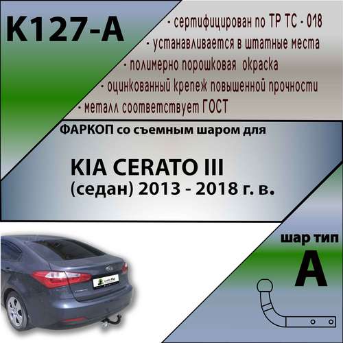 ТСУ для Kia Cerato 2013-2018 без выреза бампера. Нагрузки: 1300/75 кг, масса фаркопа 14,5 кг (без электрики в комплекте)