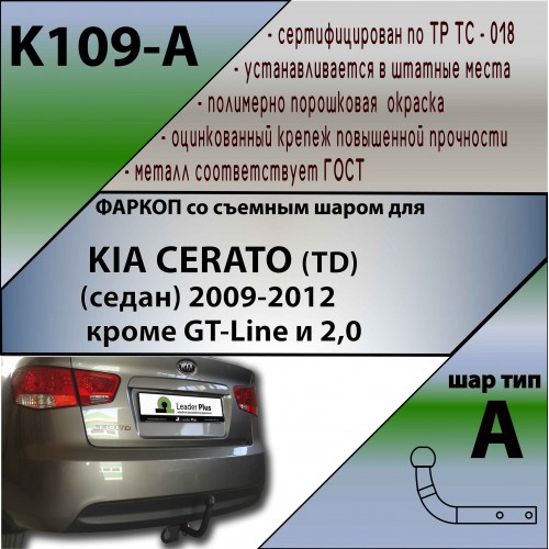 ТСУ для Kia Cerato седан 2009-2013 без выреза бампера. Нагрузки: 1300/75 кг, масса фаркопа 18,24 кг (без электрики в комплекте)