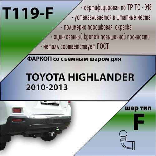 ТСУ для Toyota Highlander 2010-2014 без снятия и выреза бампера. Тип шара: F. Нагрузки: 2000/100 кг, масса фаркопа 19,28 кг (без электрики в комплекте)