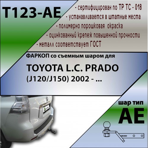 ТСУ для Toyota Land Cruiser Prado J120 2002-2009, Toyota Land Cruiser Prado J150 2009-2023. Требуется подрезка бампера. Тип шара: AE. Нагрузки: 1500/75 кг, масса фаркопа 7,48 кг (без электрики в комплекте)